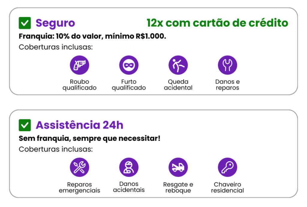 Você pode escolher entre só seguro; só assistência 24h com o monitoramento; ou todas as opções juntas.